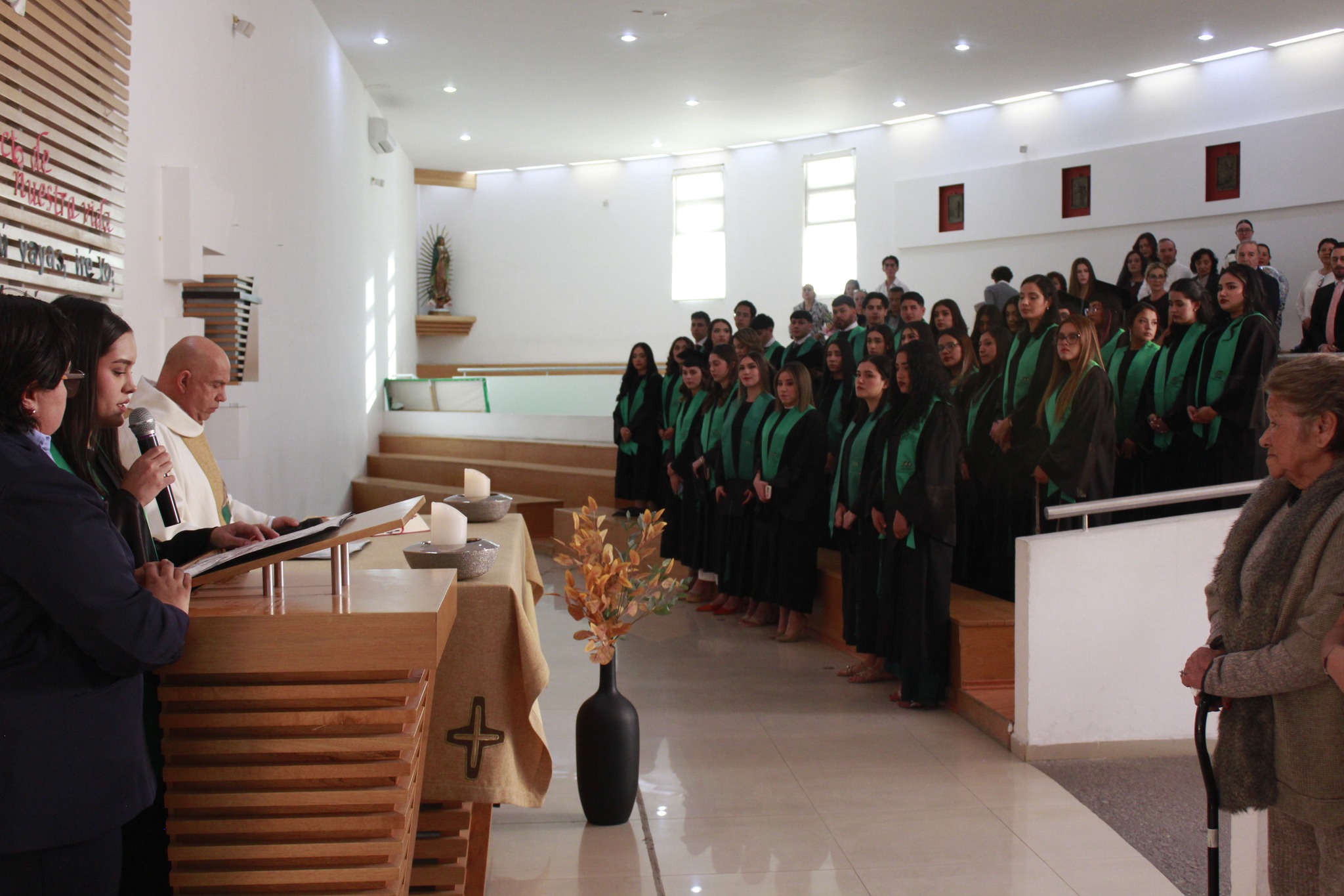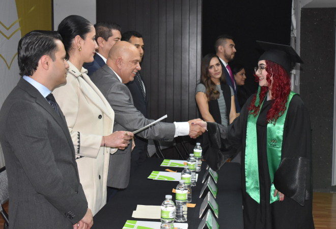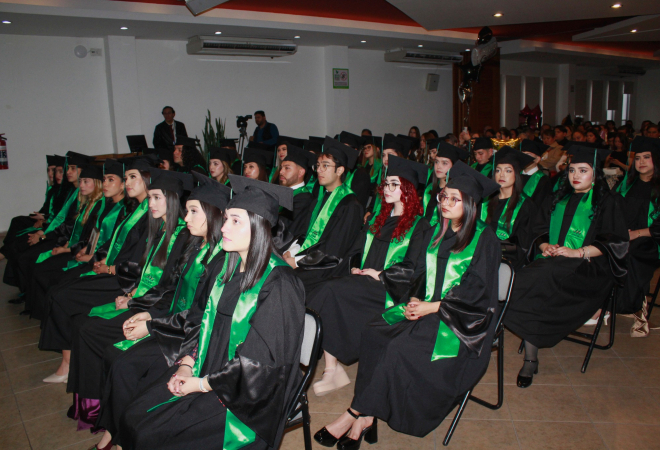 El rector, P. Gerardo Maya González, dirigió unas inspiradoras palabras en las que destacó el compromiso social y la vocación de servicio de nuestros egresados, recordándoles que son agentes de cambio en un mundo que necesita de su conocimiento y liderazgo para promover el bienestar y la salud. El LIc. Armando Ruiz Rocha, director de Vinculación y Egresados, expresó un emotivo mensaje para desear el mejor de los éxitos a los graduados. En el presidium también se contó con la presencia de la Mtra Michel Teniente Avilés, vicerrectora académica, del Lic. Aarón Guerrero Castillo, director de Fortalecimiento Académico, el Lic. Carlos Salas Gallardo, director de Admisión y Extensión Universitaria y de los coordinadores académicos.